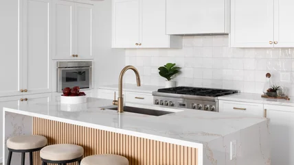 While tile backsplashes have long been the norm, slab options are a stellar alternative for adding a luxe look to any sink or stovetop area. The seamless design requires less maintenance and is often more durable. There are full-height and shorter options, ideal for macro and micro additions. A quartzite backsplash also instantly elevates a wet bar cabinet or a coffee nook, and placing the stone in a separate area from the main countertops — say the kitchen island or sink surrounds — means they don't have to match.
