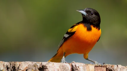 Orioles are prevalent throughout central and eastern North America during their mating season and head south to warmer climates around late summer. They're pretty easy to identify: Adult males feature a vibrant orange underside with a black head and wings, while the females are a muted yellow-orange with greyish-brown wings. Both have long, slender legs and a pointed beak. Orioles tend to idle and feed high up in the trees, but they are known to swoop down for certain foods they like.