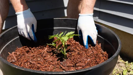 As for what to use to make nutritious mulch, the easiest way is to gather fallen leaves from around your yard. The drill's speed, combined with the DIY line trimmer attachment — the paint mixer and cable tie combo — shreds the leaves or other organic materials, creating free mulch for your yard or garden. In fact, this tool works best on dried, crispy foliage — it's perfect for repurposing bags and bins of fallen leaves to give garden soil an extra boost. Put on some safety glasses, gloves, pants, and a long-sleeved shirt, then fill the trash can with leaves and lower your new tool into the top few inches of the pile. Turn on the drill and run it until the giant pile of leaves is condensed into a usable mulch that will protect your garden soil and help your plants thrive.