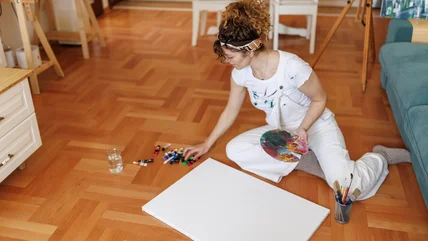 All you need is some joint compound or spackle, a putty knife, a disposable plastic knife, small bottles of craft paint in 12 complementary colors, a paintbrush, a measuring tape, a pencil, an oversized canvas, and a frame in a matching size. Aim for small bottles of acrylic craft paint to keep the cost down. Before investing in a canvas and frame, search thrift stores for a large, framed wall hanging. You can repurpose old canvas wall art by resurfacing it for a fraction of the cost of a fresh canvas and new frame. Also find a circular template that's a good scale for the size of your frame.