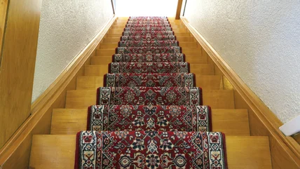 Your choice of color and pattern of your runner is up to you, but there are a few rules of thumb to consider. First, there are two ways you can have a stair runner installed in your home. One method is called "Hollywood," wherein the runner is tucked underneath each stair's edge, showing off the shape of the stair. The "waterfall" method instead covers the stair's edges completely and is only secured where the stair meets the riser, giving a more uninterrupted look. Then, you'll select your material, like wool, sisal, cotton, or jute.