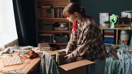 To start, determine how big you want your shelves, and then cut a few out of cardboard. Next, using an awl or another tool, poke holes through the material. You want them near the four corners, at least a ½ inch away from the edges on either side. Next, you want to take your fabric and wrap it around your cardboard to make it look a little nicer. You can use the hot glue to keep it in place. Another option besides fabric is to use wallpaper or shelf liners to wrap your shelves. Make sure you pierce the hole through whatever covering you are using as well.