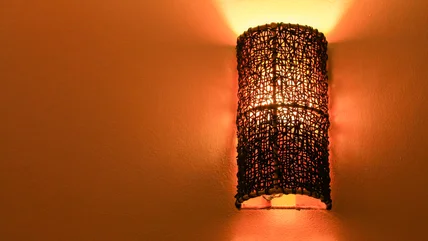 Once you have the shape you want, grab the glue and put some on all of the metal rungs so that you can stick the placemat right around the rack. Use clothespins, binder clips, or hair clips to hold the edges in place until the glue dries completely, which could take at least an hour. Take three pieces of elastic or picture wire and tie them from one side to the other at the back of the frame, spacing them fairly evenly. Not only will these allow you to mount the sconce on the wall, but they also offer support for the paper plates you're going to insert. These will be what you mount your puck lights onto using something like double-sided tape or glue. Put one light at the top and one at the bottom. Now all that's left to do is hang your sconce on the wall and turn on the lights.