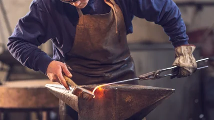 Next, Beacham welded the five rebar pieces together to form one thick bundle. "I'm going to heat them up and then I'm going to twist them probably three or four times," he explained. After firing the rebar pieces so the middle of the bundle was red hot, he clamped one cool end tight and grabbed the other cool end with a wrench. Beacham muscled it into a beautiful twist, then pounded out any bends at the anvil once more.
