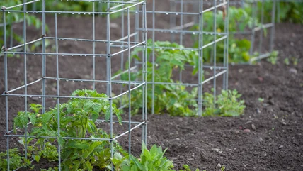 Tomato cages, a "love them or hate them" gardening item, can easily add to clutter in a shed or basement. The cylindrical structures are designed to fit around growing tomatoes, keeping them upright in small spaces. But they're not as effective with indeterminate tomatoes, which are different because they keep growing during the whole season and can eventually tip the cages over. Some people simply prefer using stakes to support their tomatoes and have extra cages on hand. Whether you regularly use tomato cages or they don't suit your preferences, they can have a use beyond just supporting the plants: turn them into mini greenhouses to protect plants in the spring. One of the best ways to repurpose tomato cages this way is to cover them with a clear plastic covering or other insulating material.