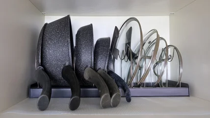 Kitchen storage and organization can feel challenging, especially in smaller spaces. You want to be able to reach for things easily without creating a mess that needs to be cleaned up. And one item that can be a struggle to keep neatly is pot lids. If you don't have enough storage space to keep your lids and pots together in the cabinets, you likely need a solution that is quick and easy. If space is at a premium in your cabinets, you may want to consider wall mounted storage as the answer to where to put your pot lids. The Carry360 2-pack wall mounted pot lid organizer from Amazon gives you space to store six lids without taking up valuable shelf space. This kitchen storage addition will free up cabinet space and keep your lids organized, whether you attach these to a wall or even on the inner doors of the cabinet where you keep your pots and pans.
