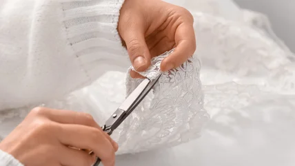 To cover the tube with lace curtain fabric, cut a piece large enough to go around it with a seam overlap that you can hide on the bottom, with extra fabric to tuck in at the ends. Apply hot glue to all of the edges and seams and then wrap the tube carefully with lace. Cut an "X" into the fabric over the tissue box hole, and fold the edges of the lace fabric to the inside and glue in place.