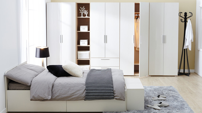 On the other hand, a wardrobe — also called an armoire or chifforobe — is a large piece of furniture that opens up to reveal storage, according to InfoBloom. It usually will contain shelving or a rod for hangers. This item is movable and not built into the wall, although it's usually reinforced so it doesn't tip over. Wardrobes can also be modular, as pictured in the above photo, meaning you can buy more than one piece to fit together as a single unit. Many people turn to wardrobes for extra storage when their home doesn't have enough to begin with, but they don't want to do any construction. That, and if they need to find a lion or a witch, naturally.