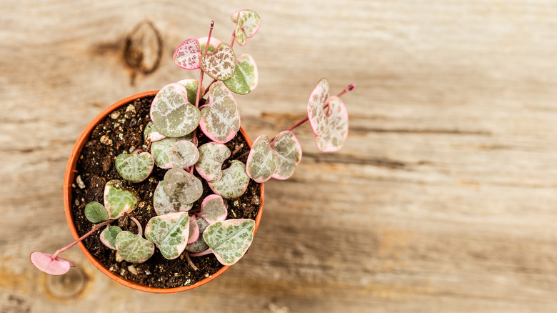 There's a lesser known counterpart to the String of Pearls that might have the burst of millennial pink you've been mulling over: the String of Hearts (Ceropegia woodii variegata). This creamy pink trailing plant is long and thin, and makes for an effortless accessory to any existing succulents in your home.