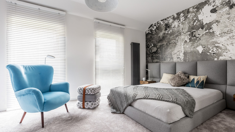 Even a bedroom decked out in grays and white can look stylish and elegant. Consider spicing up a boring white bedroom with a creative wall like the once in this photo. Who says a neutral room can't inspire a pop of creativity?