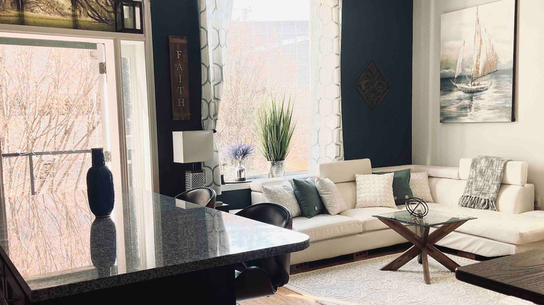 Venture to Boise, Idaho, and be blown away by the beautiful use of blues in this one-bedroom retreat's living room and kitchen area. From the light blue paint on the island to the living space's gorgeous royal blue, it creates a calming and airy space. We couldn't be more inspired!
