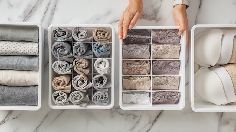 You can better utilize the shelf space you have in your closet by investing in plastic, cloth, or wicker bins to organize smaller clothing items. This is also great if you don't have space in your room for a dresser.