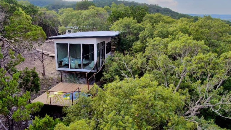 This tiny villa in Marble Falls, Texas sits on a ridge overlooking the owner's 100-acre property. The space features modern, minimalist architecture with a Santorini-inspired archway, French doors, and floor-to-ceiling glass walls, according to Airbnb. Enjoy taking the rope bridge down to the deck and the cool plunge pool.