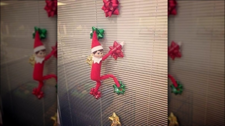 If the holidays have you climbing the windows and walls, have your elf join in. Gift bows make good "rock" climbing accessories.