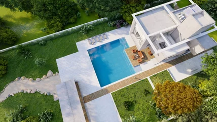 Infinity pools are magnificent works of art. If it weren't for the trees, you would think this pool was connected to the sea in the distance. In this view, it's almost as if the house is simply floating on the water.