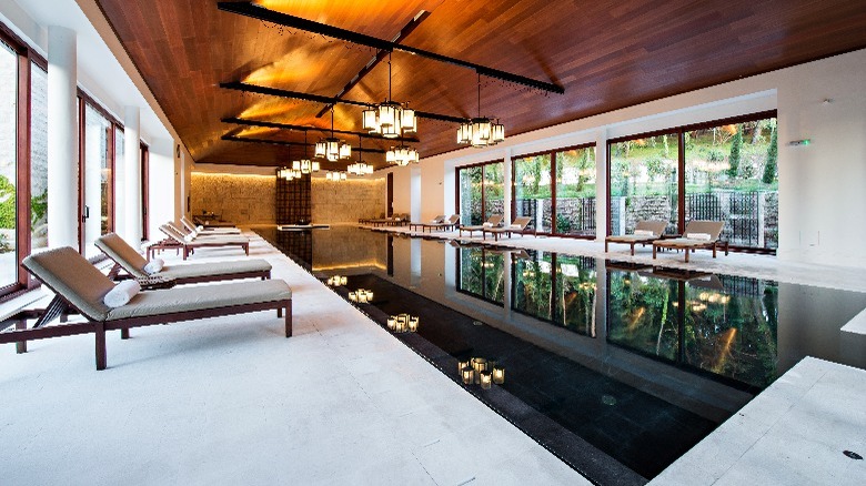 If you want an indoor pool that looks like a spa, this is an excellent design to strive for. It's beautiful, perfectly lit, and filled with comfort.