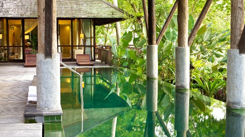The water coming down from the wall or building at the end of this pool resembles the water cascading from a faucet as you soak in the bathtub. It's like having a giant luxury tub to swim around in.