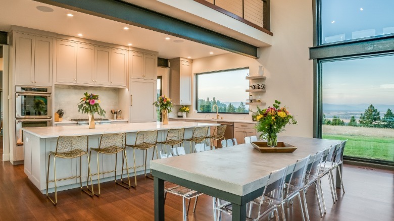 Even if your kitchen is white, think of the ways you can add pops of color here and there. From the accents of green paint to the gorgeous gold chairs, this room looks like it was made for dinner parties.
