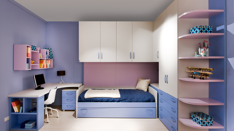 Purple can be paired with lively greens or sunny yellows, as well as accented with anything from black to white, per Apartment Therapy. Additionally, it's important to not only keep your own preferences in mind when it comes to the overall color scheme that you'd like to achieve, but you should also keep your specific space in mind. That's because deeper purples may be too dark for rooms without a lot of light while lighter purples can help to open up a smaller area.