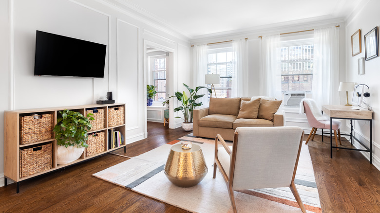 Finally, if you're trying to work with a few different tones between your hardwood flooring and wood furniture pieces, there is a quick and easy way to help out any problem areas — and you can use things you already have at home. As Yellow Brick Home instructs, you can use things like rugs or larger furniture pieces like fabric or leather-covered sofas and chairs to essentially serve as a buffer between the tones to help blend them and improve the overall look. Elements like rugs are particularly useful if you're struggling to pair wood furniture legs with wood flooring, for example.