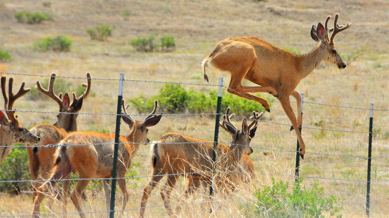 Deer are known to enjoy snacks in well-tended gardens and sample on different shrubs near residential homes. Westchester Wildlife explains that the average deer will be deterred by a fence at least 6 feet tall but can jump as high as 8 feet if under duress. As a result, many homeowners add extra layers of wire or lattice atop regular fences to keep these gorgeous pests away from their plants.