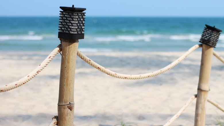 In addition to daytime use, some fences serve a purpose after dark. Solar fence lights can help provide a friendly atmosphere and promote safety on almost any type of fence — even this simple rope and bamboo beach fence.