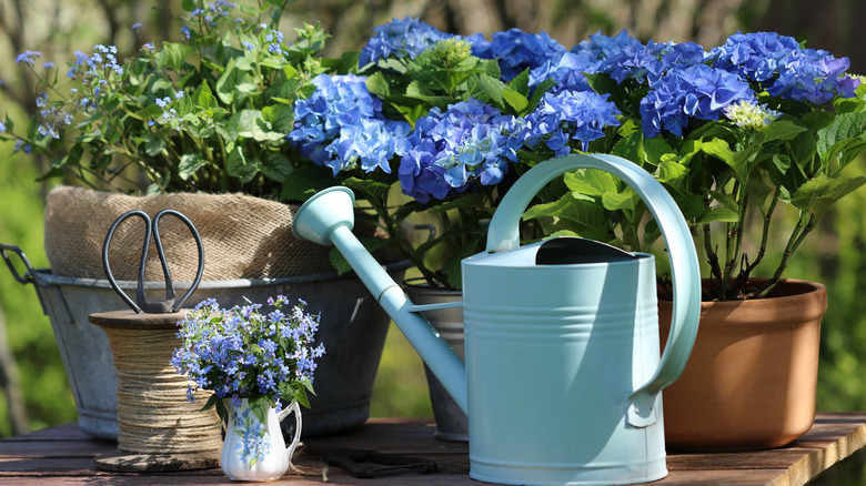 Potted indoor hydrangeas are often considered temporary — enjoy the flowers while they're blossoming and let the plants go when they're done. One reason they don't tend to make it through a winter is that they require 6 to 8 weeks of chill hours, or stratification, to bloom again the following season. Chill hours occur when temperatures hover around freezing for an extended period of time, which is not something you're likely to achieve inside your home. Indoor hydrangeas also need a significantly high amount of bright, indirect light without exposure to harsh, direct sunlight. Remember, too, that hydrangeas drink a lot more water than average plants. Couple that with the fact that container-grown plants dry out faster than those in the ground, and you can see that your plant care routine is getting a bit complicated.