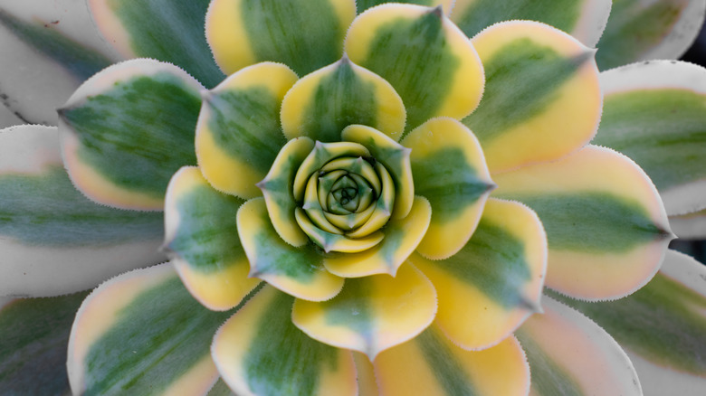 Sunburst succulents, or aeonium sunburst plants, are a type of succulent that's relatively easy to care for, per Garden's Whisper. You may have heard this succulent called by other names, including copper pinwheel or tree aeonium. It ultimately gets its name because the rosette leaves look like rays of the sun. The rosettes of the succulent are quite large, and the copper-toned tips on them are beautiful.