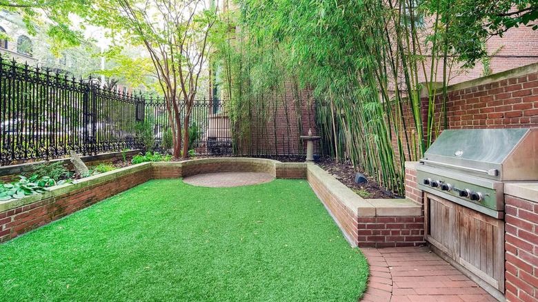 Outside, inhabitants have no shortage of space for entertaining al fresco or just relaxing and taking in the city's views during the warm weather months. There is a deck on the roof, with a balcony and garden. The backyard, though small, allows for enough room for a large grill and some storage. Additionally, there is a flower bed with shrubs on one side, and a wall planter with bamboo stalks on the opposite side flanking the grill.