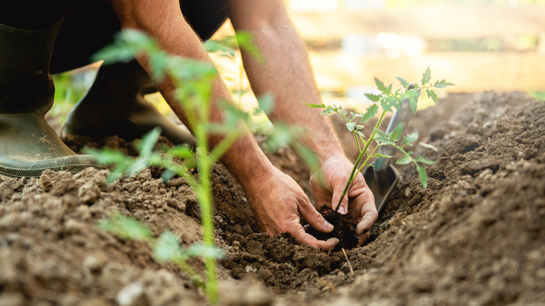 Dig a hole deep enough so that the top two leaves of each seedling are buried and press gently down on the soil around it to remove air pockets and firm up the soil over your plant. Measure out the growing space. Beefsteak tomato plants need at least 2 feet of space between each other. If you're planning on planting more than one row, then leave 4 feet between rows (via Savvy Gardening).