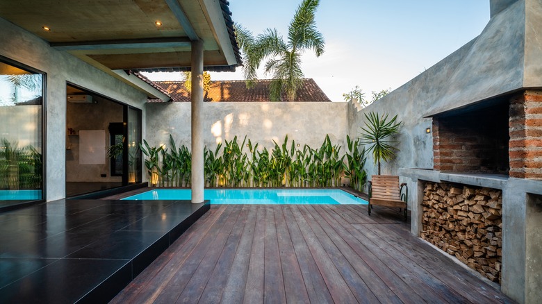 This expansive patio with luxe wood floors has everything you could want to enjoy an expensive evening of entertaining. If this were our abode, we'd position a built-in bar next to the grill, which would really pop in front of the red and black wall.