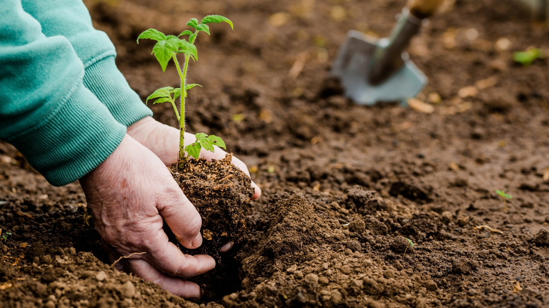 The Spruce points out that tomatoes grow roots from all parts of their stem, so the part of the stem that is underground will grow roots, providing support for the plant. More roots means that your plant will have more opportunities to consume water and other nutrients from the soil. Deep roots means that your plant has more opportunities to find water. The Spruce recommends burying your plant in a hole up to the bottom of the healthiest leaves on the plant, and removing any small leaves that you intend on burying. Always loosen the root ball before planting and water the plant immediately after transplanting. Carefully place any stakes or cages to avoid damaging the root ball.