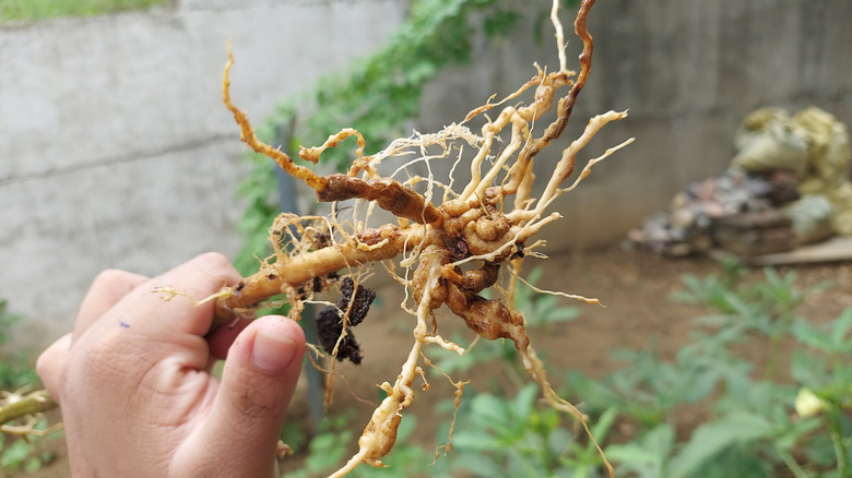 One of the most devastating things that can happen to your tomato crop is root-knot nematodes. According to Clemson Cooperative Extension, these microscopic organisms attack the roots of your tomato plant, and the only way you'll know if you have them is to examine plant roots. If your plants become discolored, stunted, or wilt easily in the heat, and nothing you've tried is working, take a look at the roots. Nematodes look like small balls or knots on the roots. Rotating your garden every three years will prevent nematodes from making a home in a particular area. The University of Florida suggests planting cowpea, sunn hemp, sorghum-sudangrass, marigold, jointvetch, velvetbean, hairy indigo, castor, sesame, and red clover to help deal with the problem.