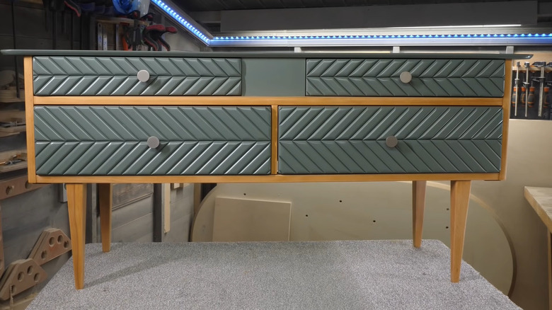 Madebyraphael added angled pieces of wood to the drawer fronts for a texture patterned. Then, after sanding down the main frame and stabilizing any broken pieces, he painted the top and drawers a gray blue, keeping the main frame the same color, and installed new hardware. The final product is trendy, sleek, and functional.
