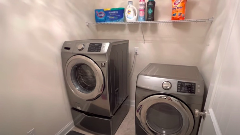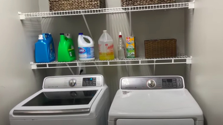 Yes, this laundry room has two shelves — which is a step above just one– and it does have has some of the laundry supplies concealed in baskets. However, it's still lacking any notable personality, and there's still a cluttered look to this tiny room.