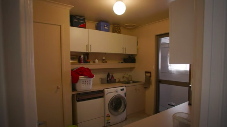 This claustrophobic laundry room is closed-in and lacking both in storage and style. There is very little walking space and no easily available spot to fold clean clothes.