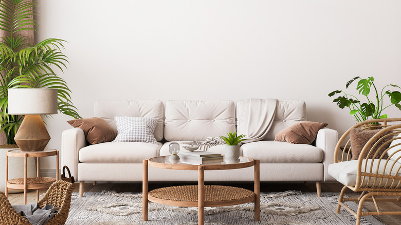 White sofas can be intimidating, but they are easier to clean and style than you think. The idea of getting a white sofa dirty is the main reason why people tend to avoid them. However, depending on the fabric of your white couch, there are ways you can prevent stains. White leather is the easiest fabric to clean, and it's durable, too: All you need is a wet cloth to wipe off a stain. The trick with cleaning stains is not to let them sit; you should be wiping any spills as soon as possible, as per The Every Girl. White linen, cotton, and polyester couches are a little more tricky: You'll need an upholstery cleaner to cleanse what you can't throw in a washing machine. Although, with these fabrics, you can use a slipcover to prevent stains altogether.