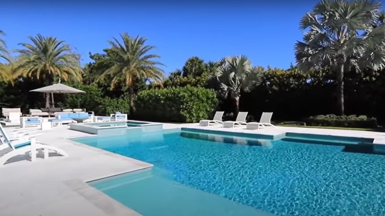 Like with most homes, the exterior is where the first impression is met. This is true even for large homes such as mansions. Perhaps, one of the most notable and eye-catching sceneries of this home is the pool. Inground and large in size, it's quite breathtaking. While being large and primarily rectangle in shape, there is a mini spa jacuzzi on the end, as seen in a video from Luxury Houses – American Homes. On the opposite side of the luxury jacuzzi is a small sitting area featuring an umbrella to provide some sort of shade in the hot Florida sun.