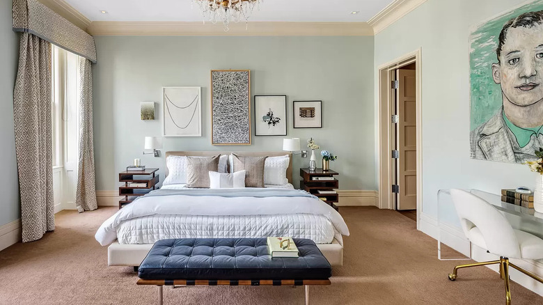 As mentioned before, the townhouse has a total of five bedrooms and eight bathrooms. Each of these bedrooms presents a modern design with lightly-colored walls and tall windows, providing each room with plenty of natural lighting. The bedrooms are lined with tan carpeting, which matches the color of the tiles in the corresponding bathrooms. The living room also has light walls and a lightly colored rug covering a darker hardwood floor. A black spiral staircase brings this style even further into the small basement area, as noted by Zillow.