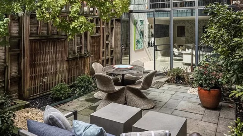 Regarding the property, the residence boasts a beautiful courtyard behind the massive building. Although the area is rather small, it provides a perfect entertaining space with two sitting areas, outdoor cooking equipment, and a variety of plants to liven the area. More opportunities for gardens and plants also extend over the small space.