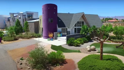 With an original idea to create a prison-inspired vibe, Penn Jillette's vision for the property quickly morphed into a hodgepodge of kitsch meets technicolored acid trip. The home looks pieced together with different wings and additions attached by twisting walkways and ramps. Moving through the property, guests are treated to complimenting and contrasting hues that run down the exterior walls of the home into the grass, with beautiful colors abound.