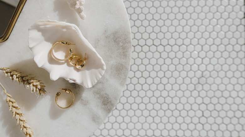 Statement pieces and knickknacks placed throughout the bathroom can give it a lovely Parisian feel, even if you can't remodel or redecorate in major ways. Gold mirrors are popular, as are whimsical chandeliers and woven baskets. Stick with gold and neutral colors. Other options include seashell jewelry trays, ivory-colored vases and bowls, and flattering plants like ferns. Wall hangings are also popular — choose modern art, black and white photos of the Eiffel Tower, or prints of the French countryside. If you want to go big, cover a section of the wall in blue herringbone tile, or paint a Parisian wall mural. Anewell is a great website for inspiration, as well as for purchasing wallpaper that simulates a mural if you don't have the time, talent, or resources to paint your own.