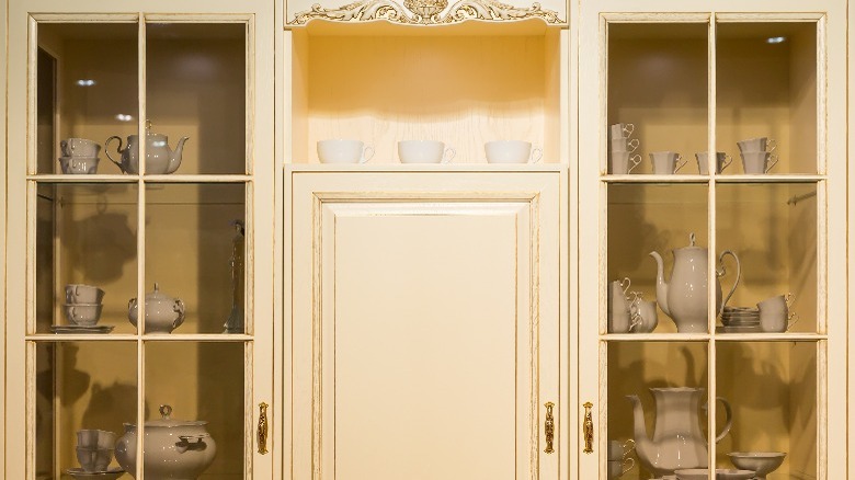 Have you recently discovered a dated china cabinet in the basement and want to upcycle it? Or, perhaps, you own a piece packed with granny's tableware, and it's neither stylish nor practical. If one of these scenarios looks familiar, you're at the right spot. Let's start by explaining what china cabinets are. According to Homemade Ginger, these one-piece items feature glass doors and are more formal and ornate variants. Their primary purpose is to display and protect china and glassware on multiple shelves and glass panels.