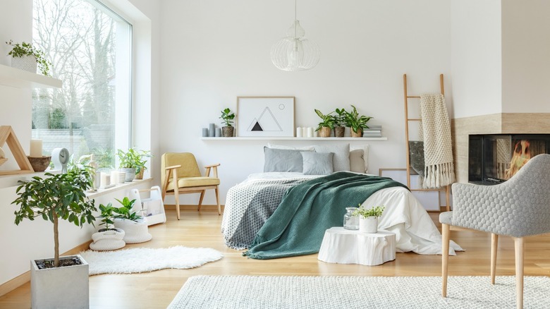 White walls allow for any color or style — they're the most adaptable, and best for displaying artwork. Additionally, they'll reflect existing colors in the room. A green blanket adds pop but repeats the fresh and natural theme of the plants throughout, while textural fabrics and organic elements are key to creating a cozy space within a white box.