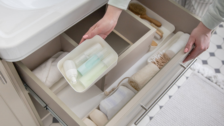Before you begin placing your items into any containers, you do want to make sure that you throw out any unused items and give your space a good clear-out. It'll give you a better idea of what items you need to replace in case some have run out of product. It's also a great time to throw out expired products you didn't know you had, via Real Homes. Regularly checking the expiration dates on your products, especially cleaning products, will be better for your bathroom. You don't want to continue using products that have expired and don't work the way they're supposed to.