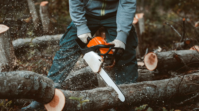 The most important consideration to make when thinking about removing a tree on your own is one of safety. A falling tree can severely injure you or someone else, so taking the hazards involved in this task seriously is the first step to getting the job done right. It's always a good idea to use ear protection when employing power tools, and whether you're swinging an ax or mattocks, or using a chainsaw to complete the job, eye protection is a must to prevent flying debris from hitting your eyes or face (via Firewood for Life).