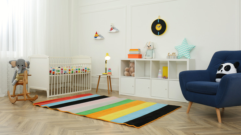 A decorative throw rug is ideal for keeping your nursery comfortable and adding charm. It brings an element of fun to an already beautiful nursery. Plus, if you have wooden floors, it adds coziness to the room. This darling white rug from Wayfair features a tall, colorful giraffe next to an elephant and a few friendly monkeys. The large area rug is ideal for a child's room as it is non-shedding and stain-resistant. That means dirt from your children or family pet shouldn't show on this rug. It weighs 15 pounds.