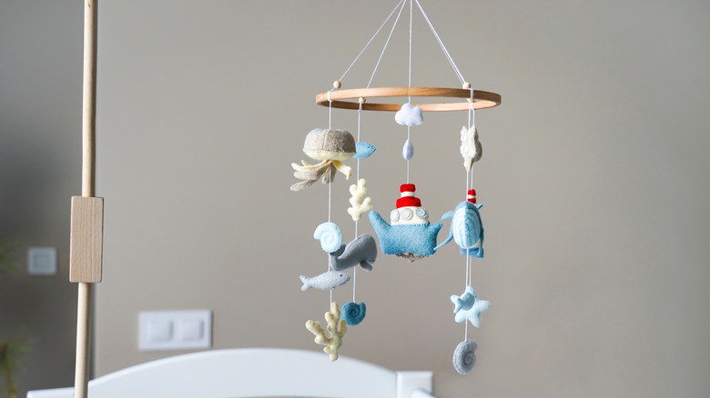 Your baby will inevitably spend a lot of time in the nursery, so having a mobile that entertains the baby is essential. To stick with the giraffe theme, decorate with the Follow Me Giraffe mobile from Maisonette. This darling mobile features tan and yellow giraffes with polka dots. They are handmade with 100 percent wool. If you're more interested in felt or velour animals, we understand.