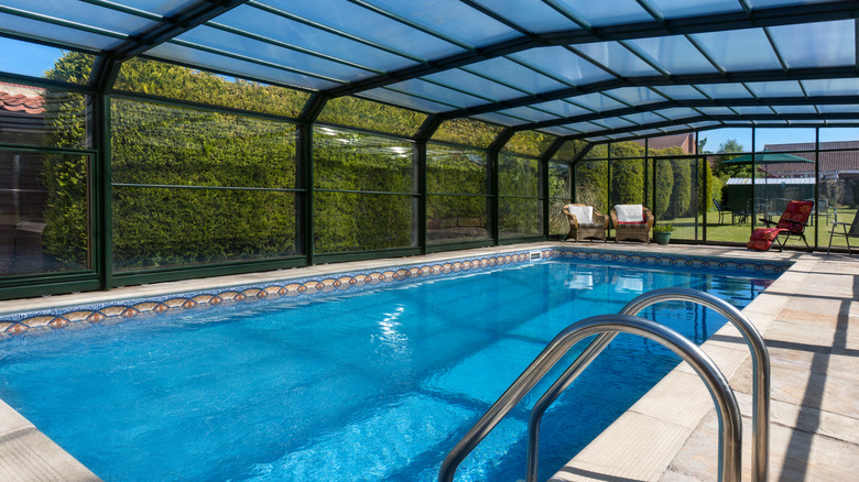 If you're willing to spend some extra time and money, pool enclosures can be a good option for you. As the wind blows on your pool, it causes the temperature to drop, which is why a windproof enclosure helps maintain your water's heat. These enclosures will protect your pool from the elements, providing the added benefit of being able to swim no matter the weather — rain, snow, or sunshine. They also work well to keep out debris and can be a safety barrier for pets or children. Pool enclosures can come in many forms, from large, building-like structures to smaller, retractable options. These structures work best in large, open spaces.
