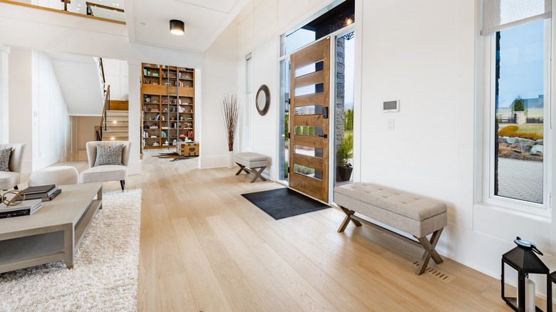 Using this additional soft layer under an area rug offers many benefits. It makes the rug feel comfortable on the toes and keeps it in place. The best materials under an area rug include rubber and felt (via The Spruce). These pads help fix the rug to a semi-permanent place without carpet tape. This tip is ideal for hallway and entryway area rugs where the furniture does not assist in keeping the position.
